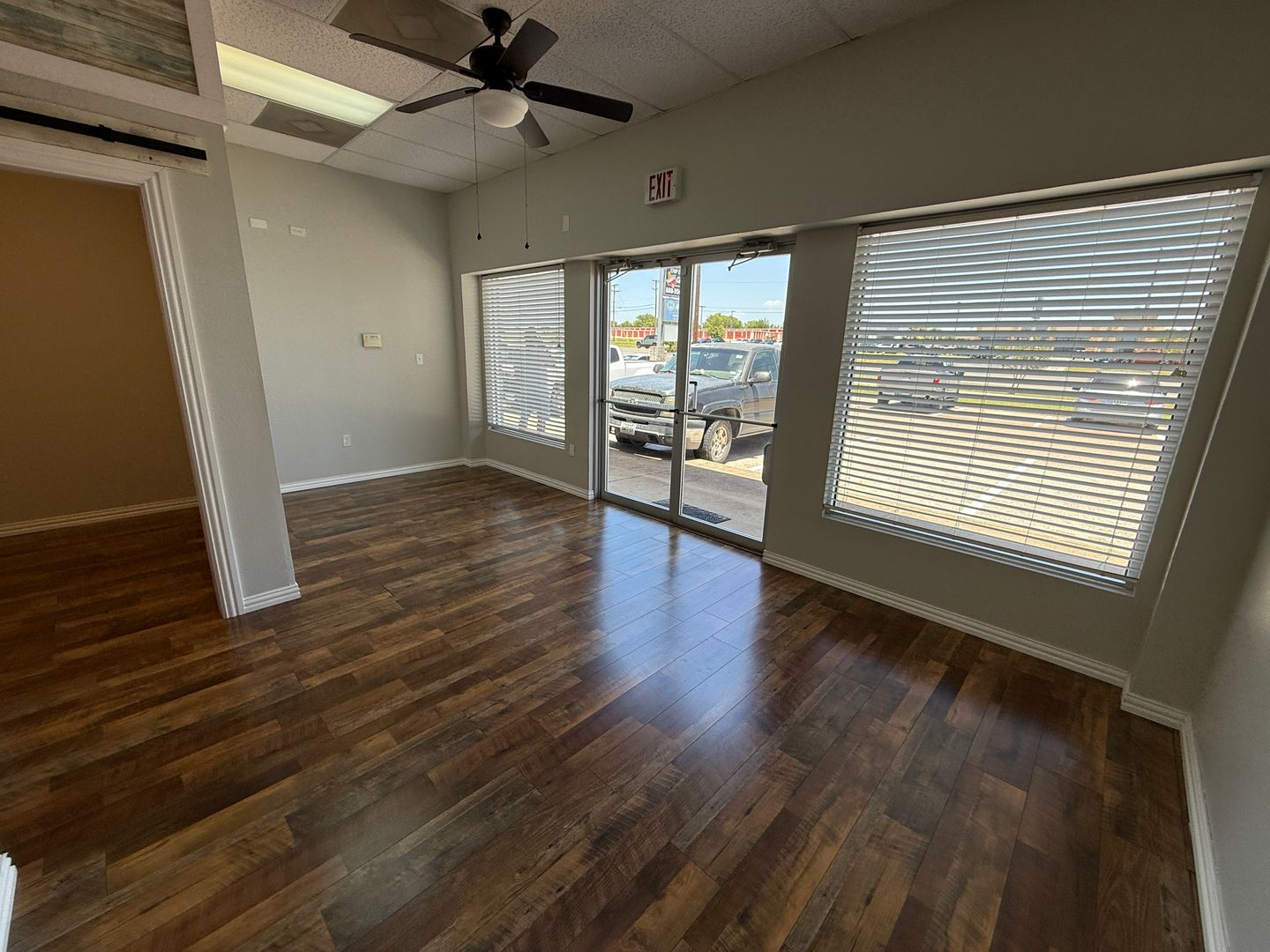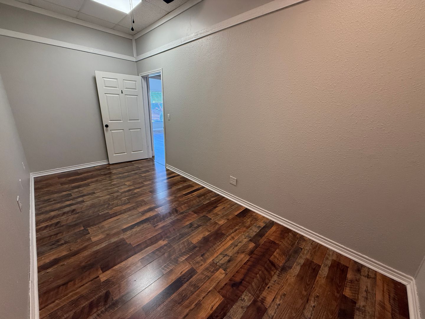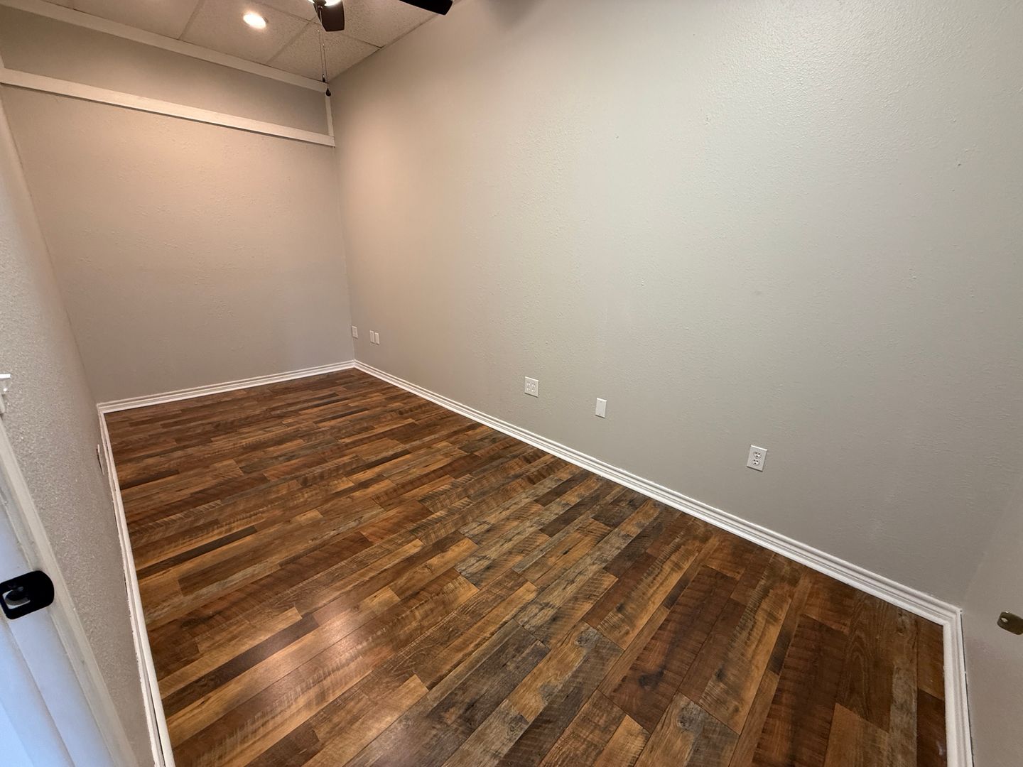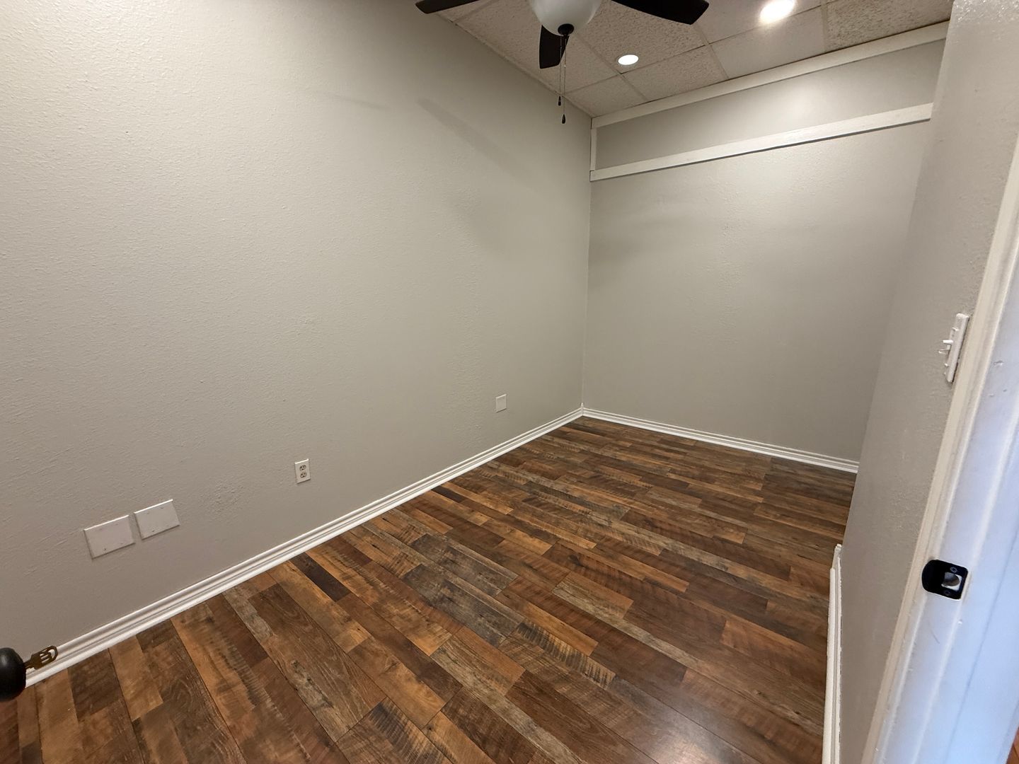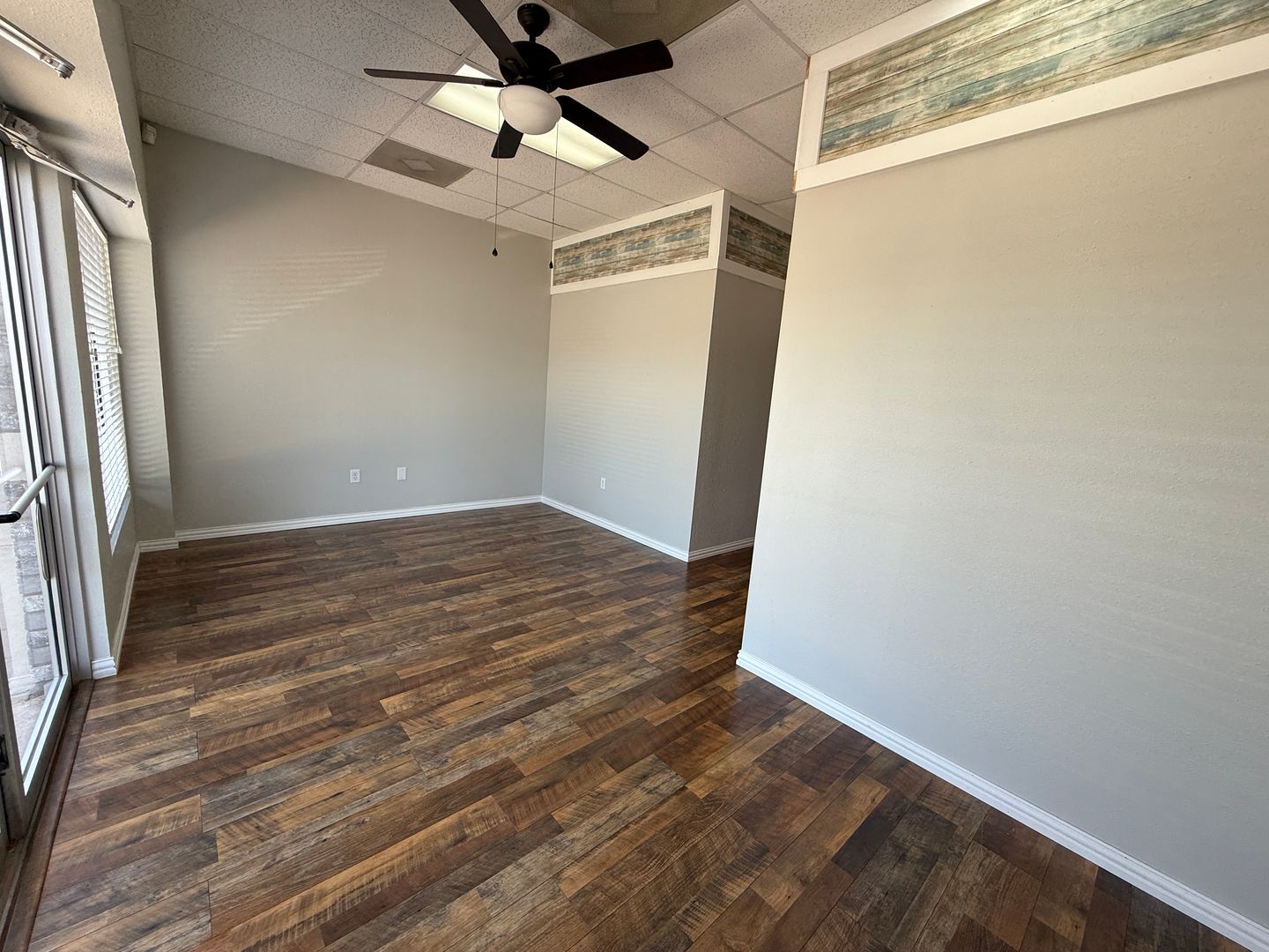 DESCRIPTION: Available Now! This 1,000+/- square foot office suite is nicely finished with gorgeous wood laminate floors, textured and painted sheetrock walls, drop ceiling with florescent lighting and lit ceiling fans with dimmable lighting. The property is very visible on Stan Schlueter which boasts over 30,000 cars per day according to TXDOT. The attractive office is vacant and ready to show.