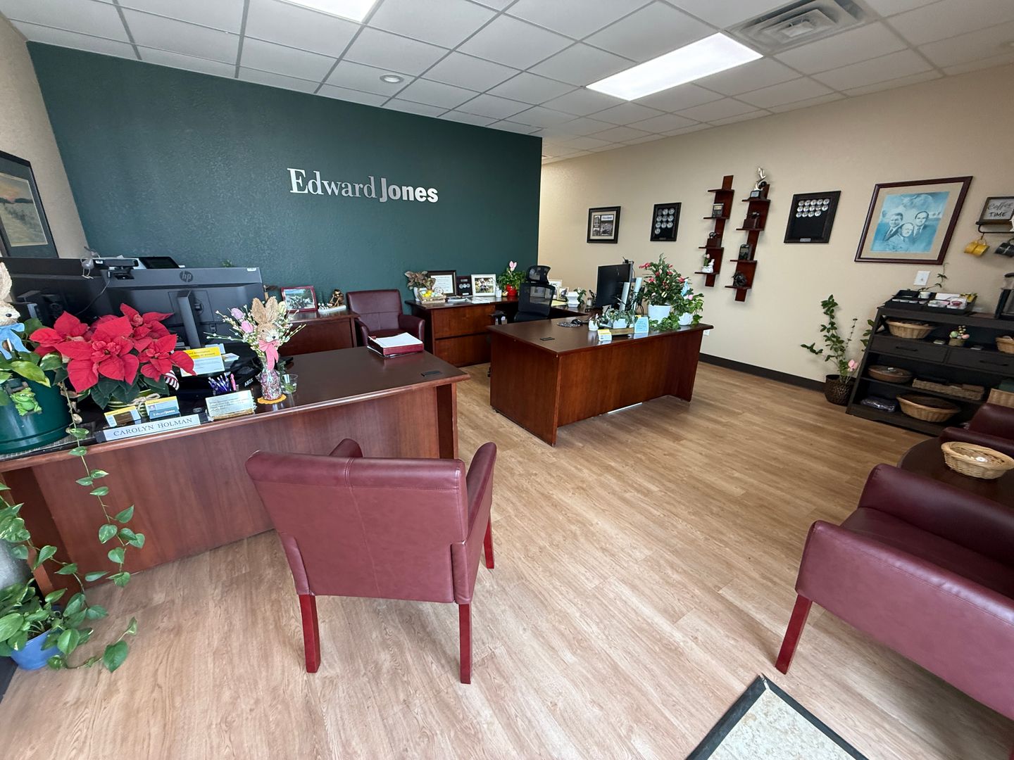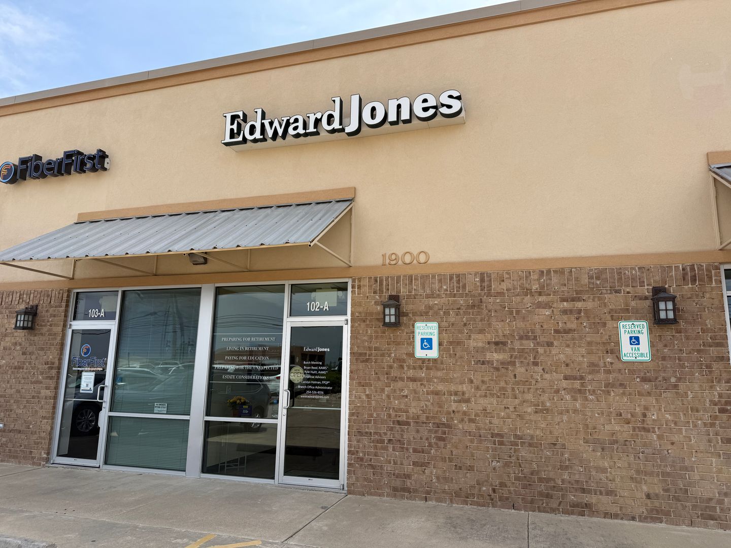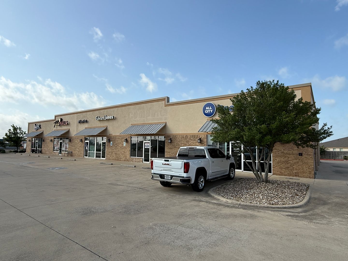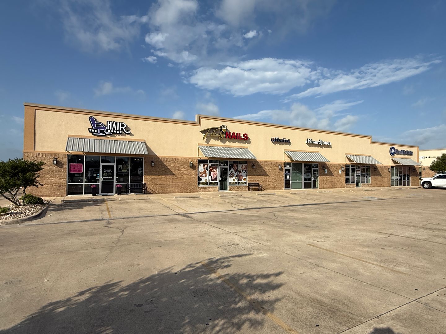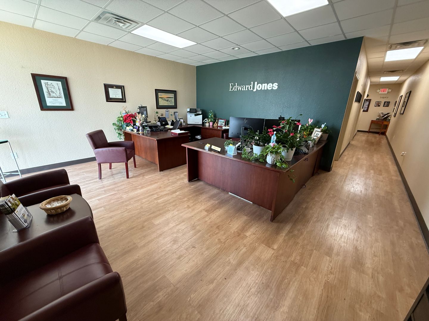 DESCRIPTION : AVAILABLE NOW. This 1,165+/- sqft finished office suite was formerly an Edward Jones office. The floorplan features a recetption/waiting area, 2 large offices, kitchenette, closet and ADA style restroom. Finishes include textured and painted sheetrock walls, VCT and carpet flooring, drop ceiling, standard lighting and electric.