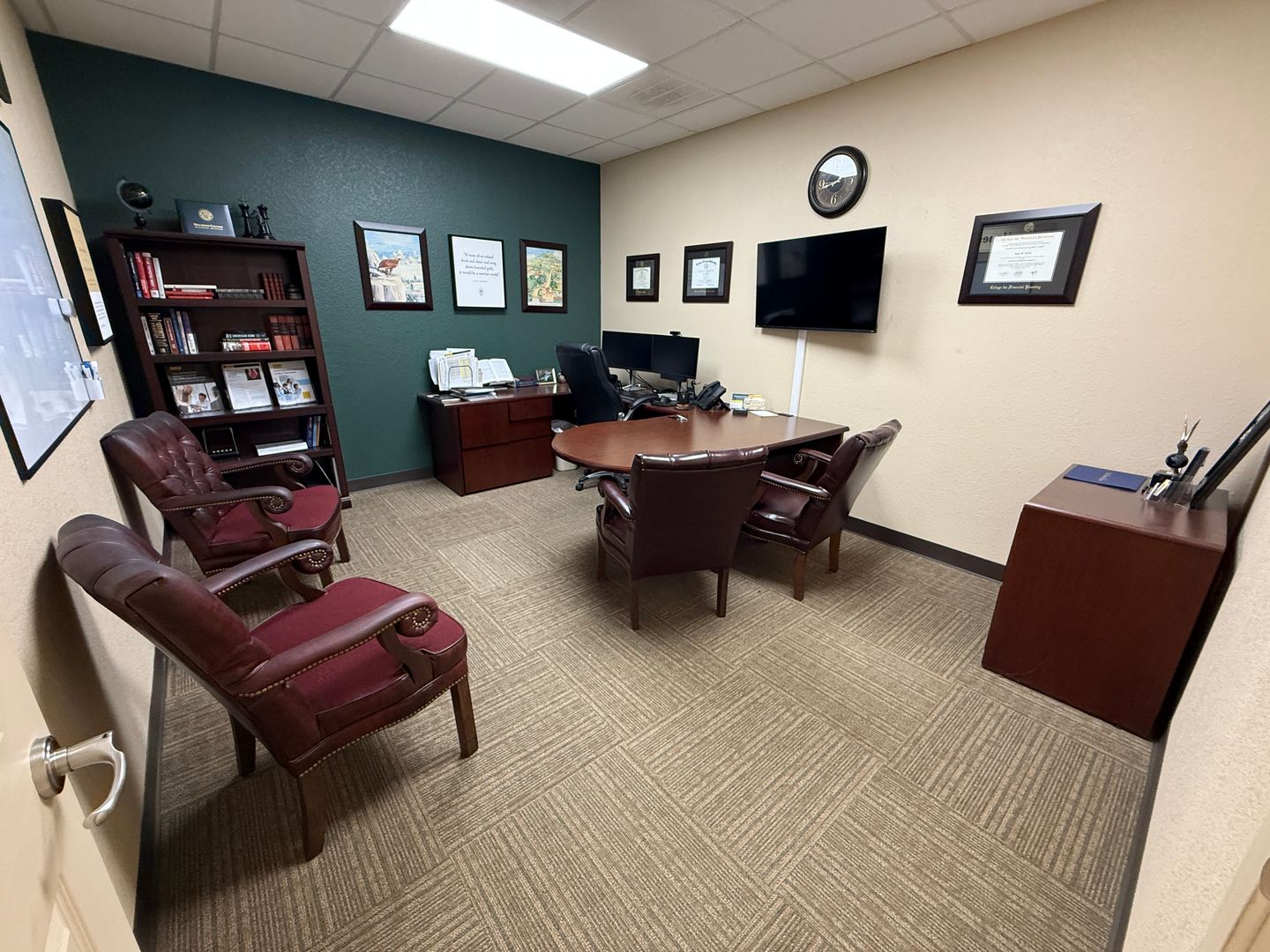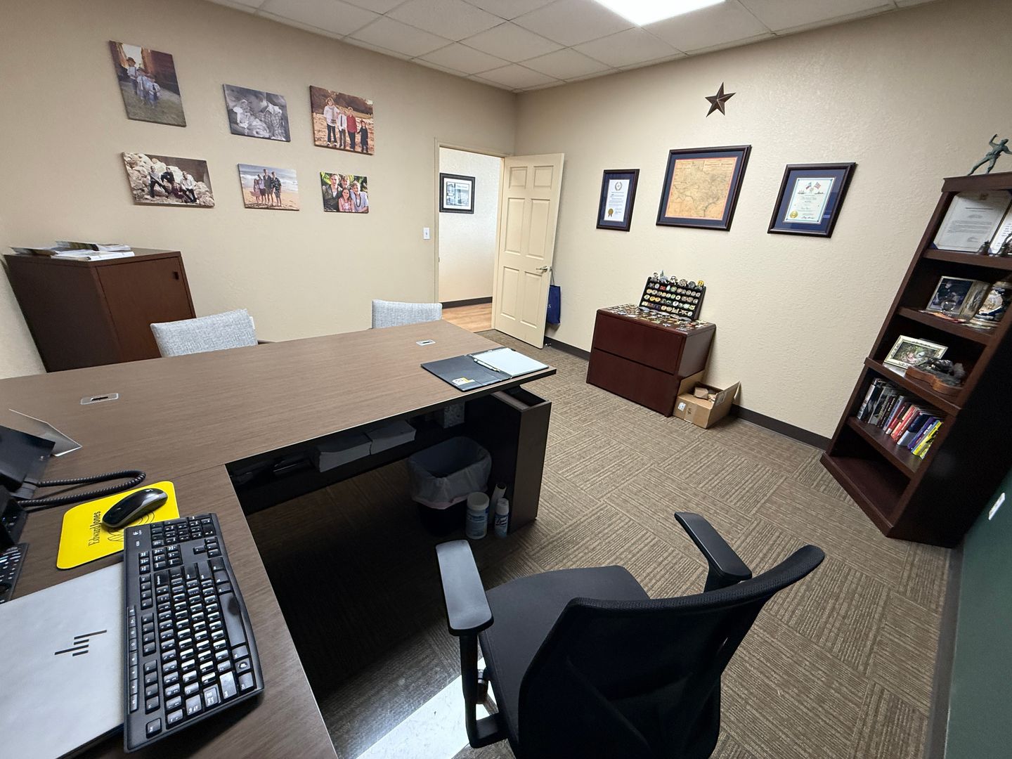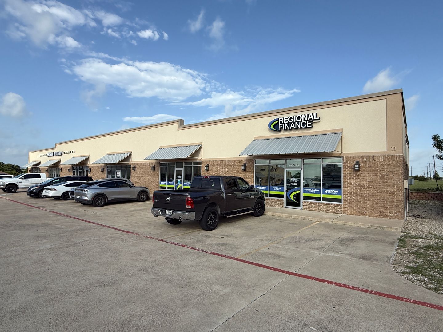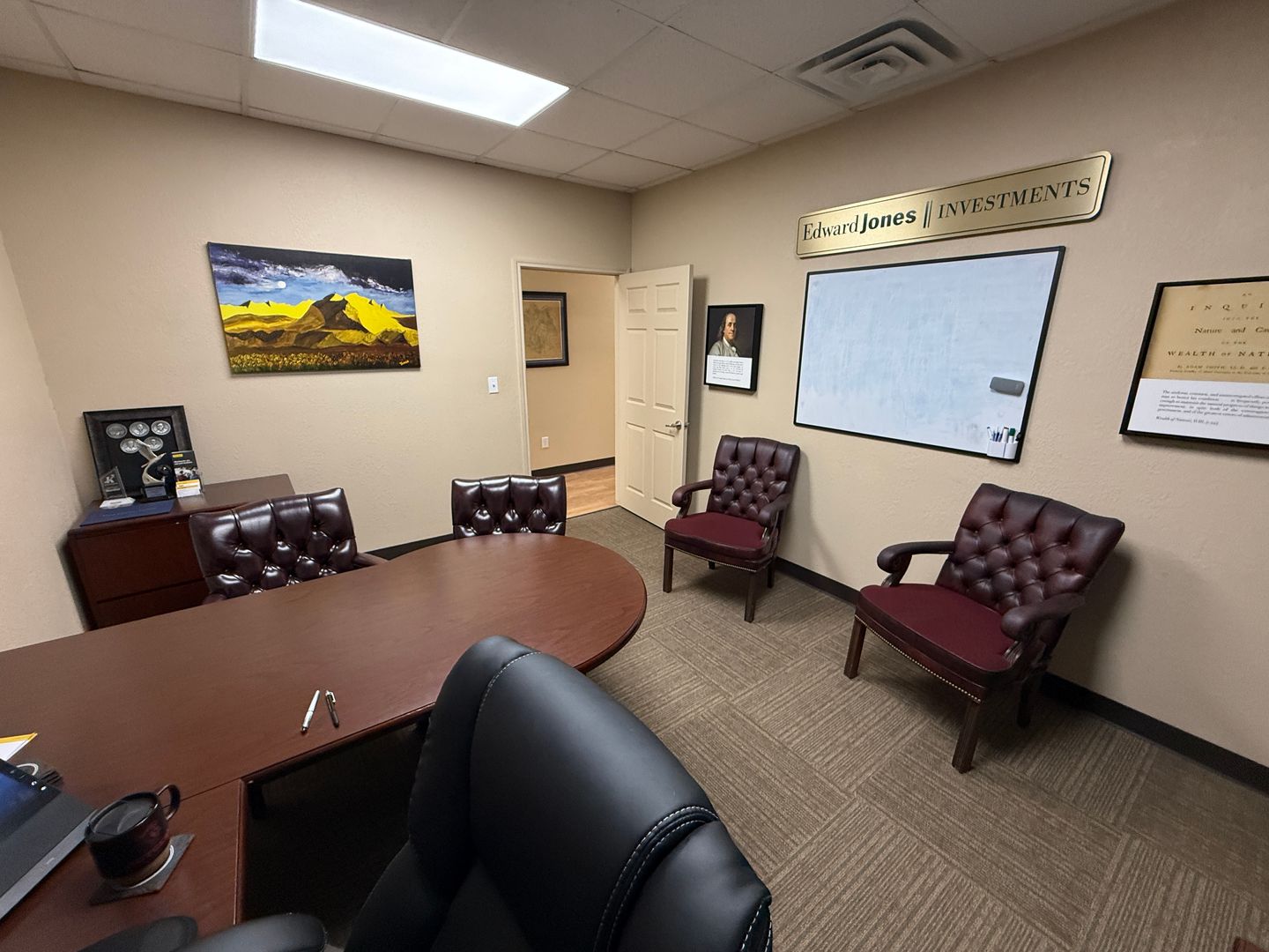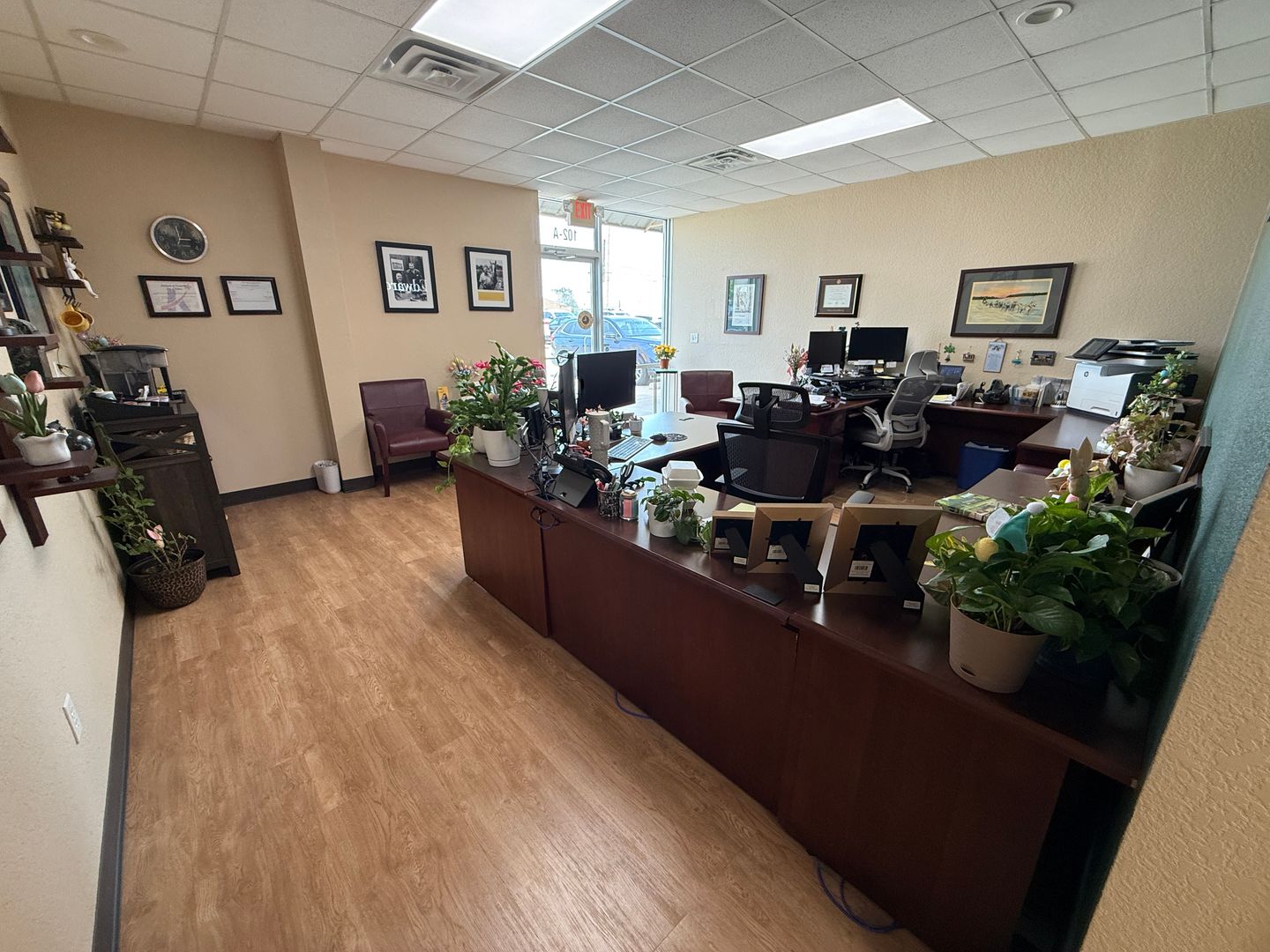 DESCRIPTION : AVAILABLE NOW. This 1,165+/- sqft finished office suite was formerly an Edward Jones office. The floorplan features a recetption/waiting area, 2 large offices, kitchenette, closet and ADA style restroom. Finishes include textured and painted sheetrock walls, VCT and carpet flooring, drop ceiling, standard lighting and electric.